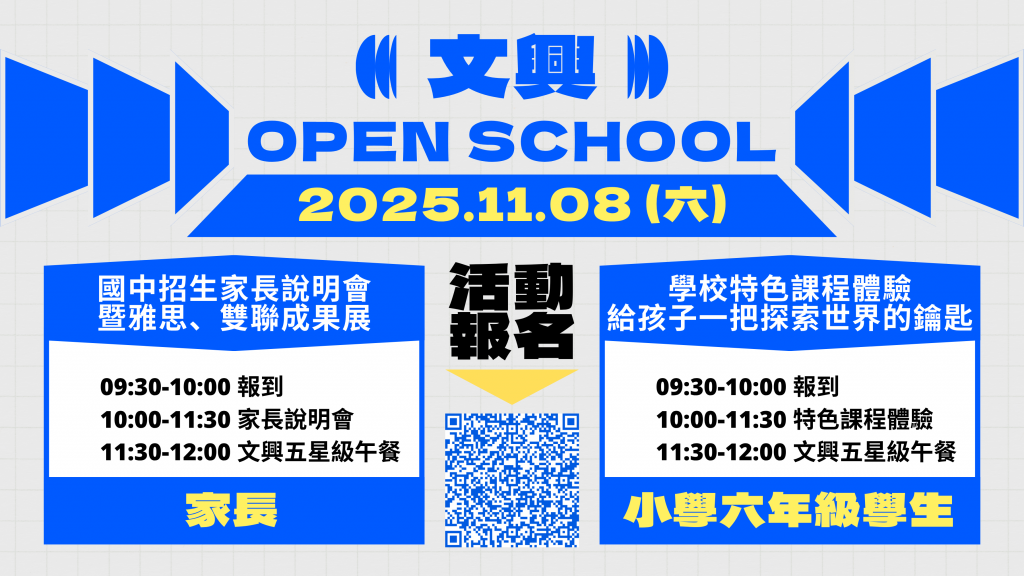 私立文興高級中學辦理「114年國小核心素養能力體驗營」海報、獎勵優秀清寒學生入學獎學金辦理、OPEN SCHOOL DAY暨招生入學說明會等資料