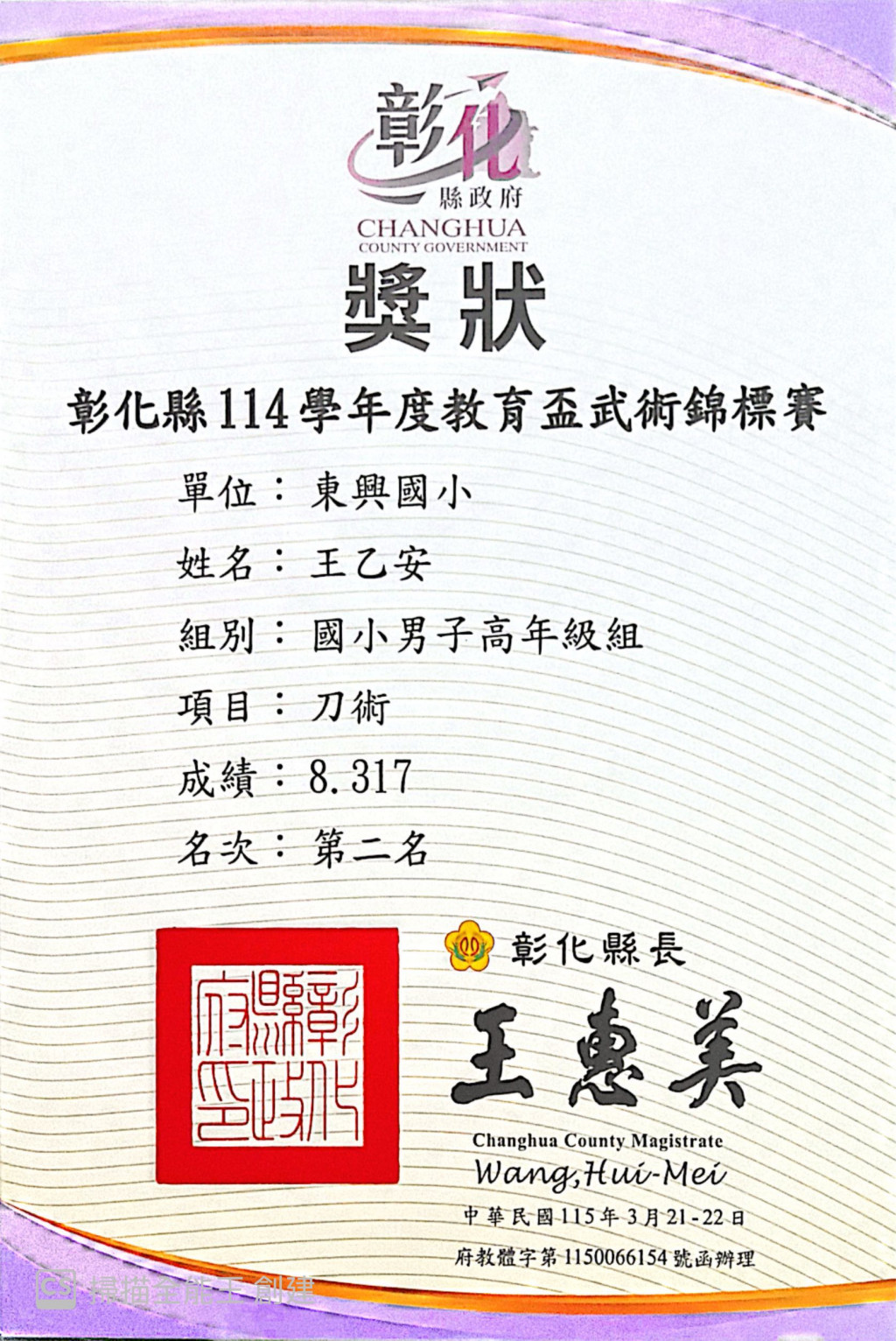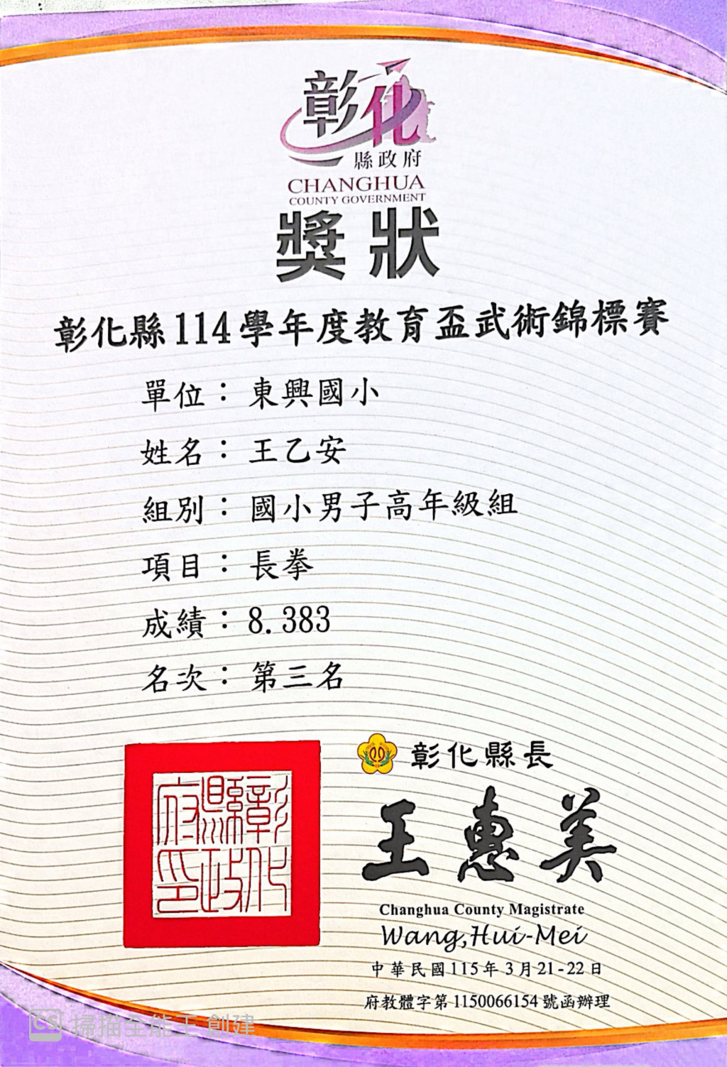 王乙安 榮獲 國小高年級組-刀術 國小男子高年級組-長拳第三名