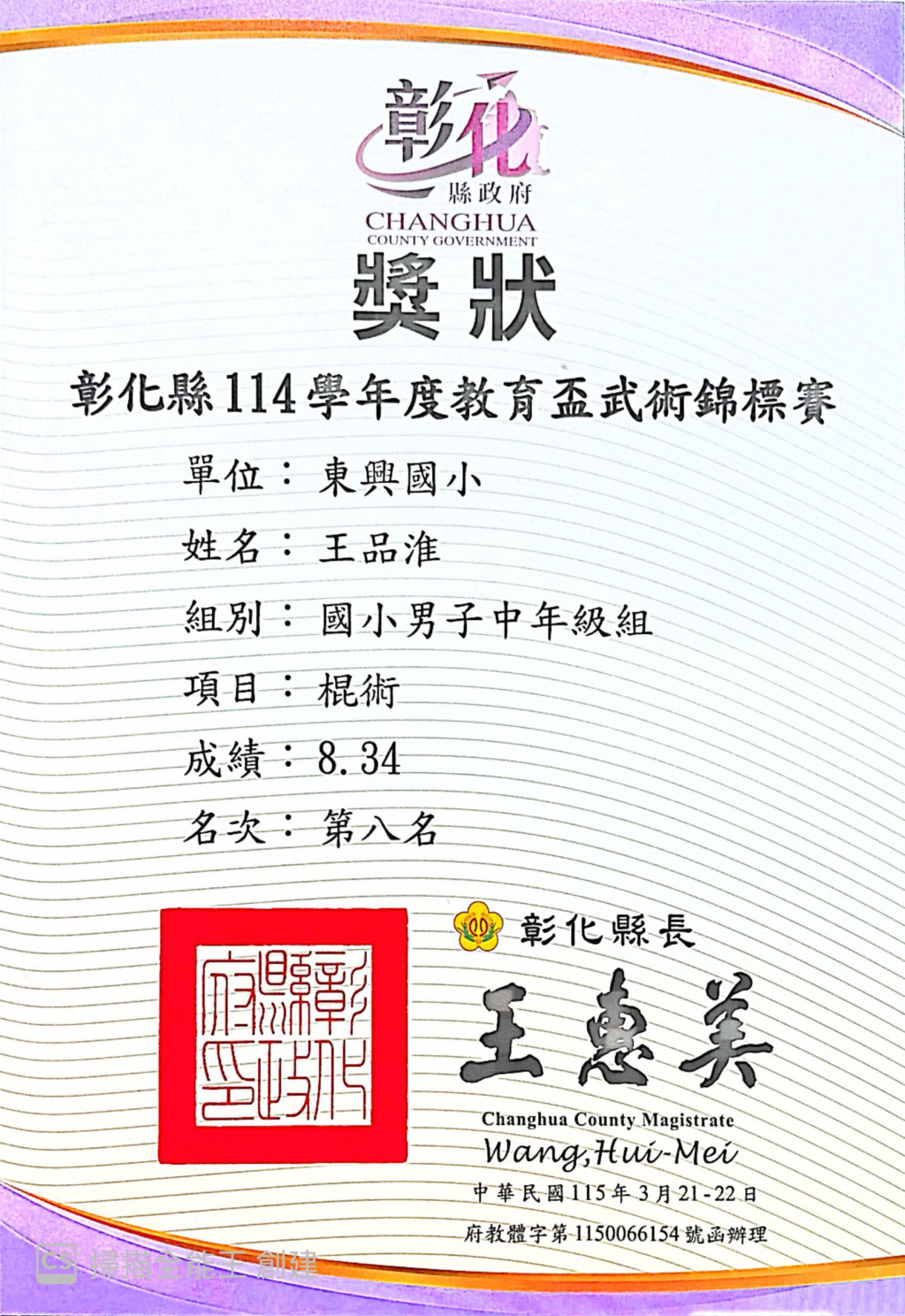 王品淮 榮獲 國小男子中年級A組-長拳 國小男子中年級組-棍術第八名